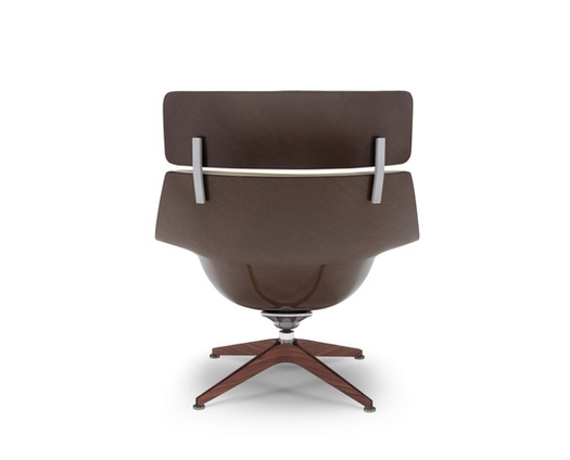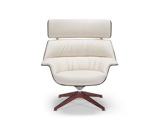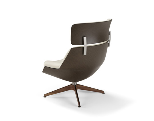 COACH ruht auf einem drehbaren Gestell aus gebürstetem Stahl, das von vier Massivholzelementen in Boomerang-Form umkleidet ist. Diese skulpturale Basis verleiht dem Ensemble Wärme und Charakter. Ausgestattet mit einem Drehmechanismus mit automatischer Rückführung in die Ausgangsposition bietet das Gestell große Bewegungsfreiheit und gewährleistet zugleich stets eine kontrollierte Sitzhaltung.