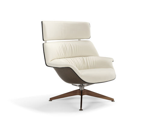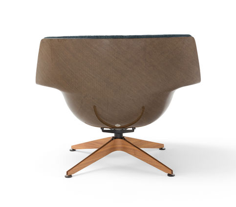 COACH se apoya sobre una base giratoria de acero cepillado, revestida con cuatro elementos de madera maciza de diseño tipo boomerang. Esta base escultórica aporta calidez y carácter al conjunto. Dotada de un mecanismo de rotación con retorno automático a la posición inicial, la base ofrece una gran libertad de movimiento al tiempo que garantiza una postura siempre controlada